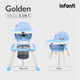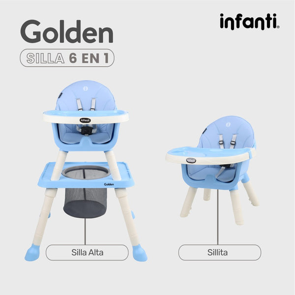 Silla 6 en 1 Golden de infanti: La silla 6 en 1 Golden ofrece múltiples funciones que permiten acompañar a tu bebé desde sus primeras comidas hasta sus primeras tareas escolares. Se transforma fácilmente en una silla alta, asiento de entretenimiento, sillita, práctico escritorio con su propia silla, mesita de juego y canastilla para accesorios, adaptándose a cada etapa de su crecimiento.