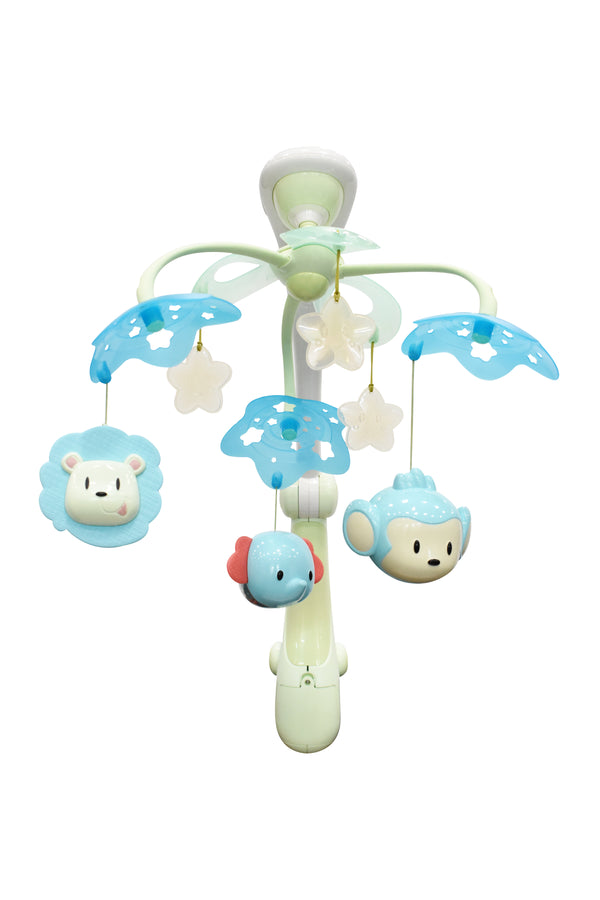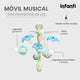 Incluye melodías suaves, proyector de luz nocturna, juguetes giratorios desmontables que funcionan también como sonajas. Estimula el desarrollo visual y auditivo del bebé. Compatible con la mayoría de las cunas mediante sistema de pinza. Requiere 3 baterías AA (no incluidas). Uso recomendado desde recién nacido.