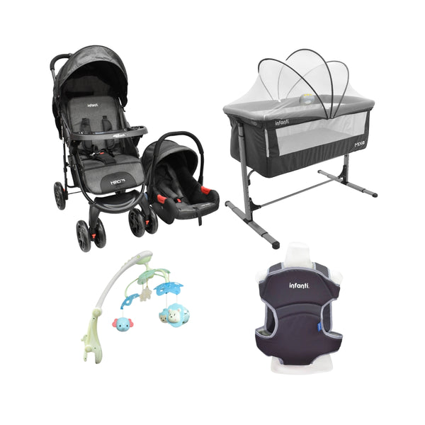 Este exclusivo combo incluye productos Infanti diseñados para el confort del bebé y la comodidad de los padres: una cuna colecho multifuncional, una carriola travel system, un canguro ergonómico y un móvil musical con proyector. ¡Todo en un solo paquete, cuidadosamente elegido!