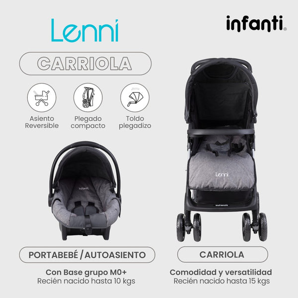 The Lenni Travel System Stroller is a versatile and complete option for parents looking for practicality and comfort in their walks with the baby. With its baby carrier that fits the stroller and works as a car seat from 0 to 9 kilograms, you can easily move from one place to another without interruptions. The backrest has 3 recline positions to adapt to the needs of your little one at all times.