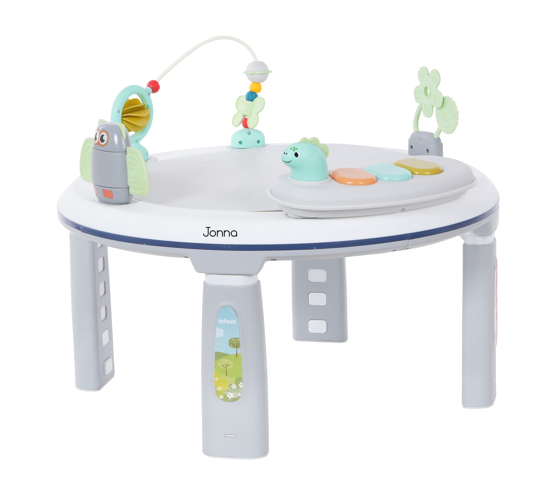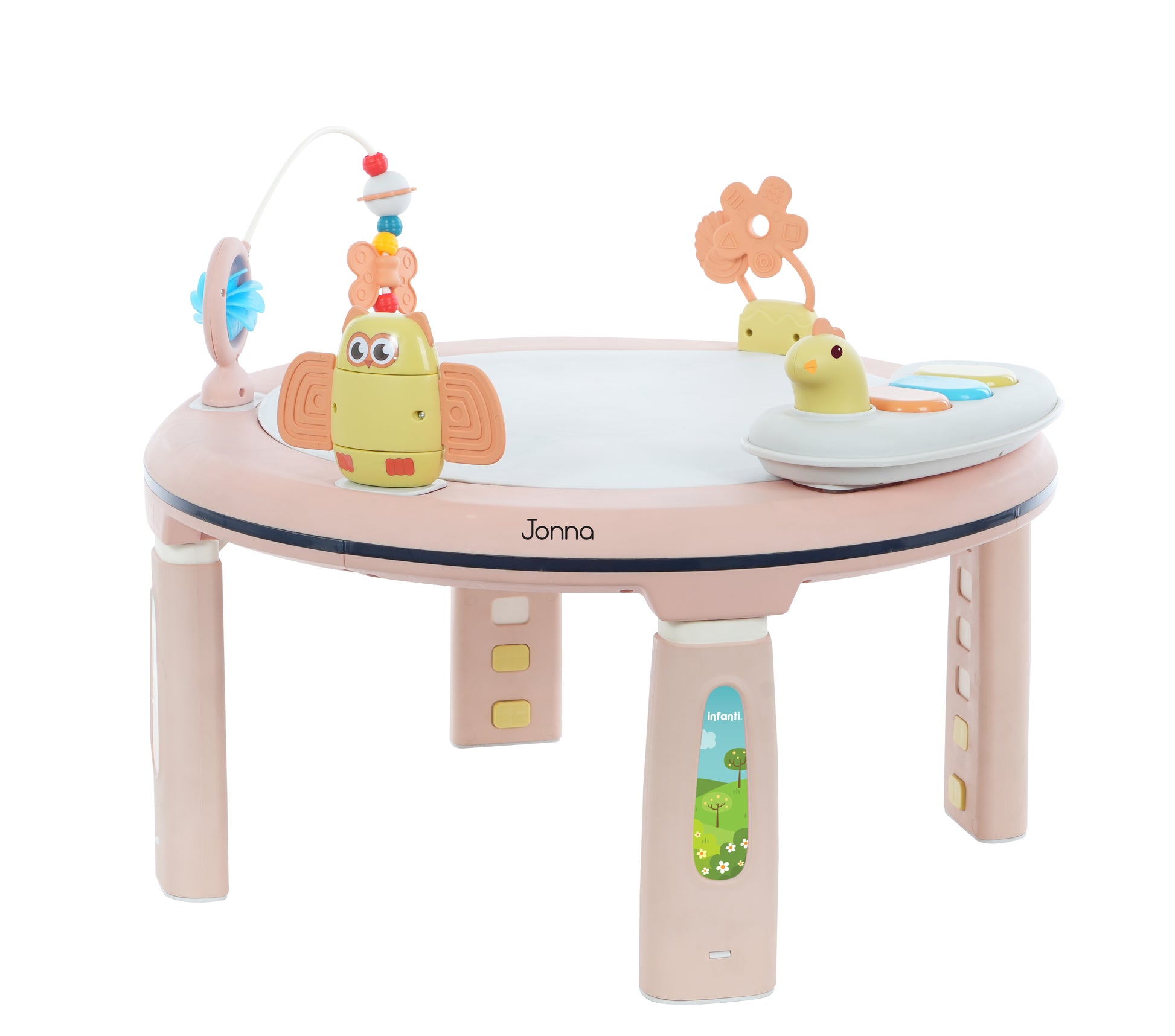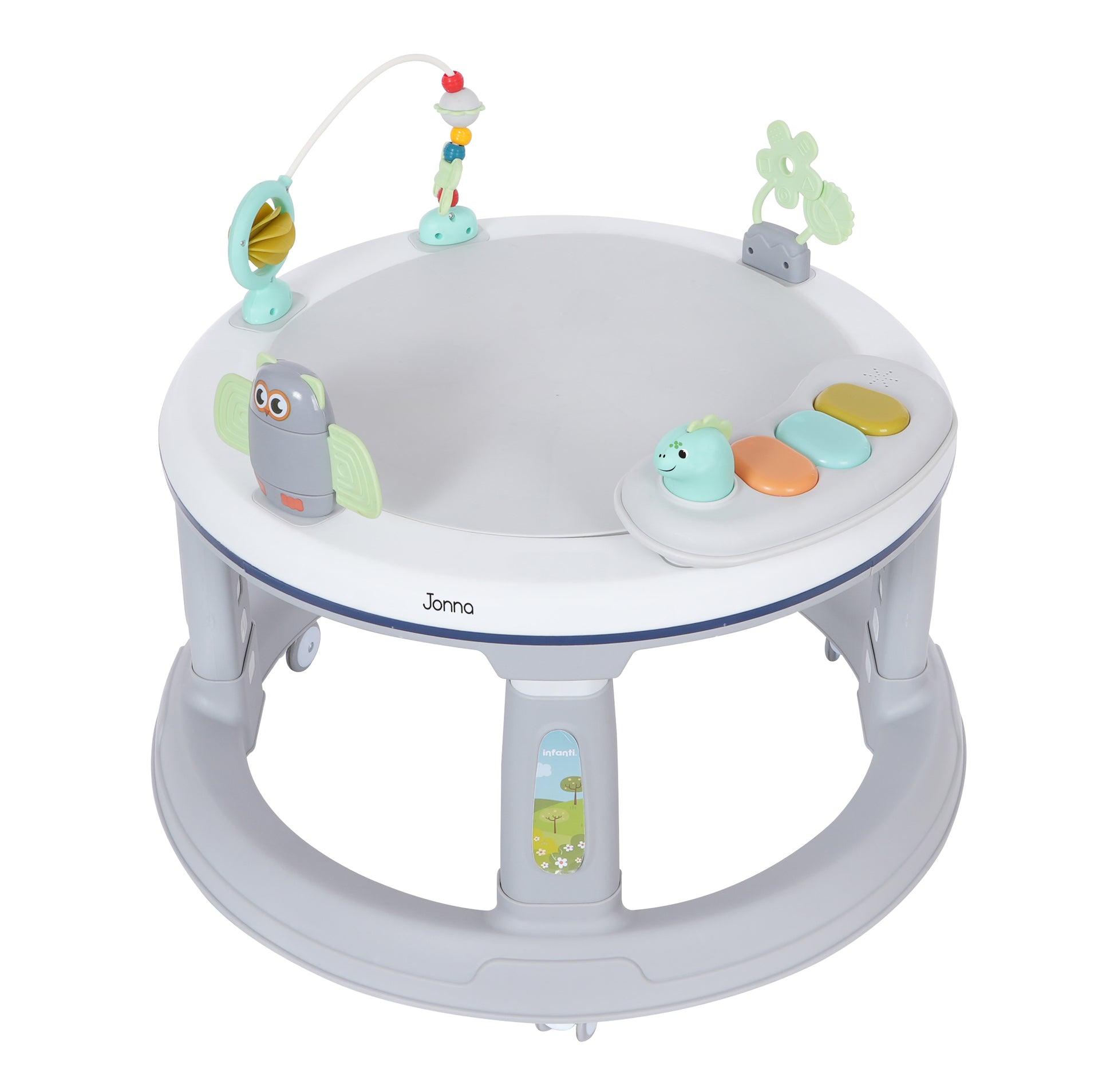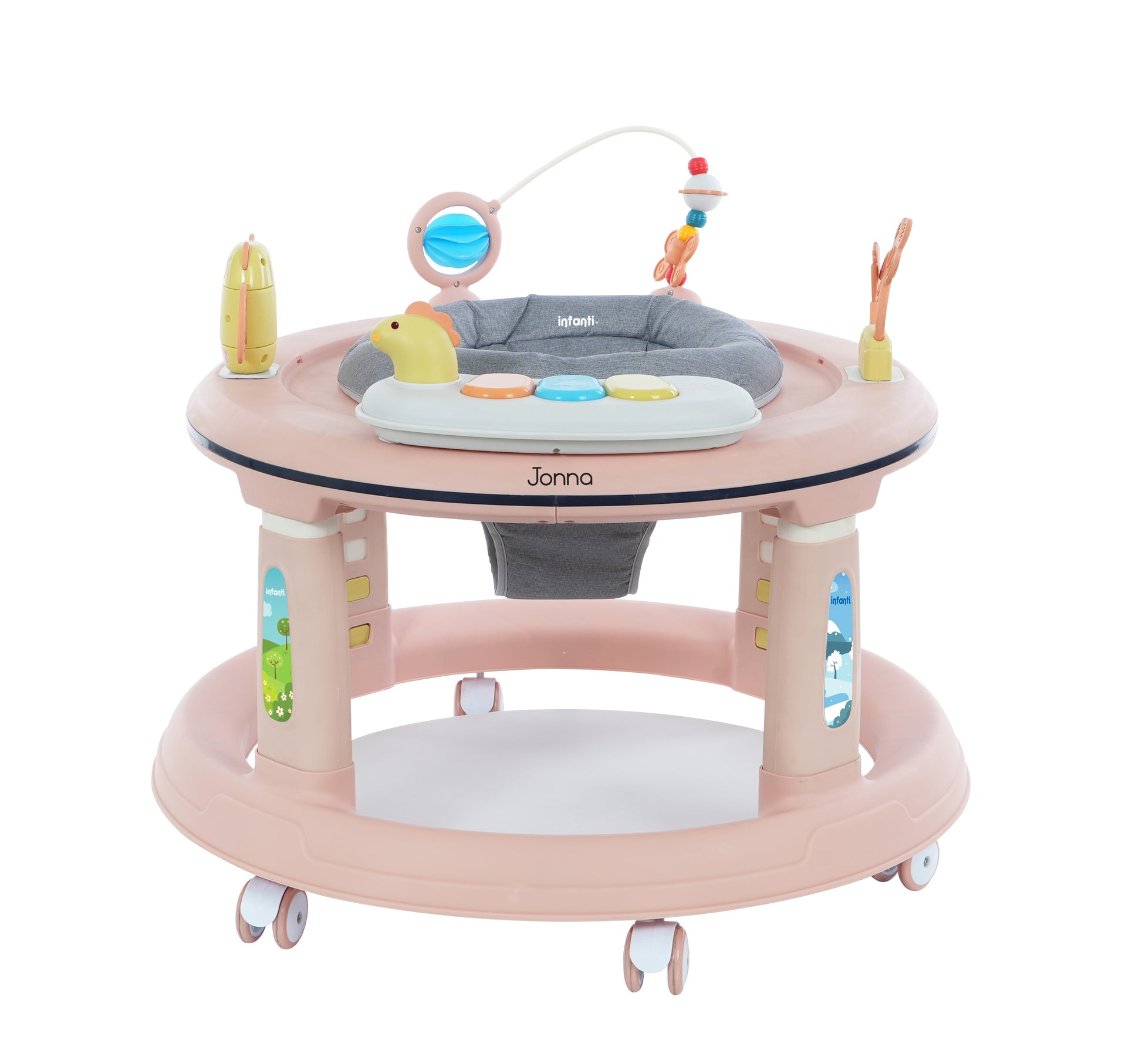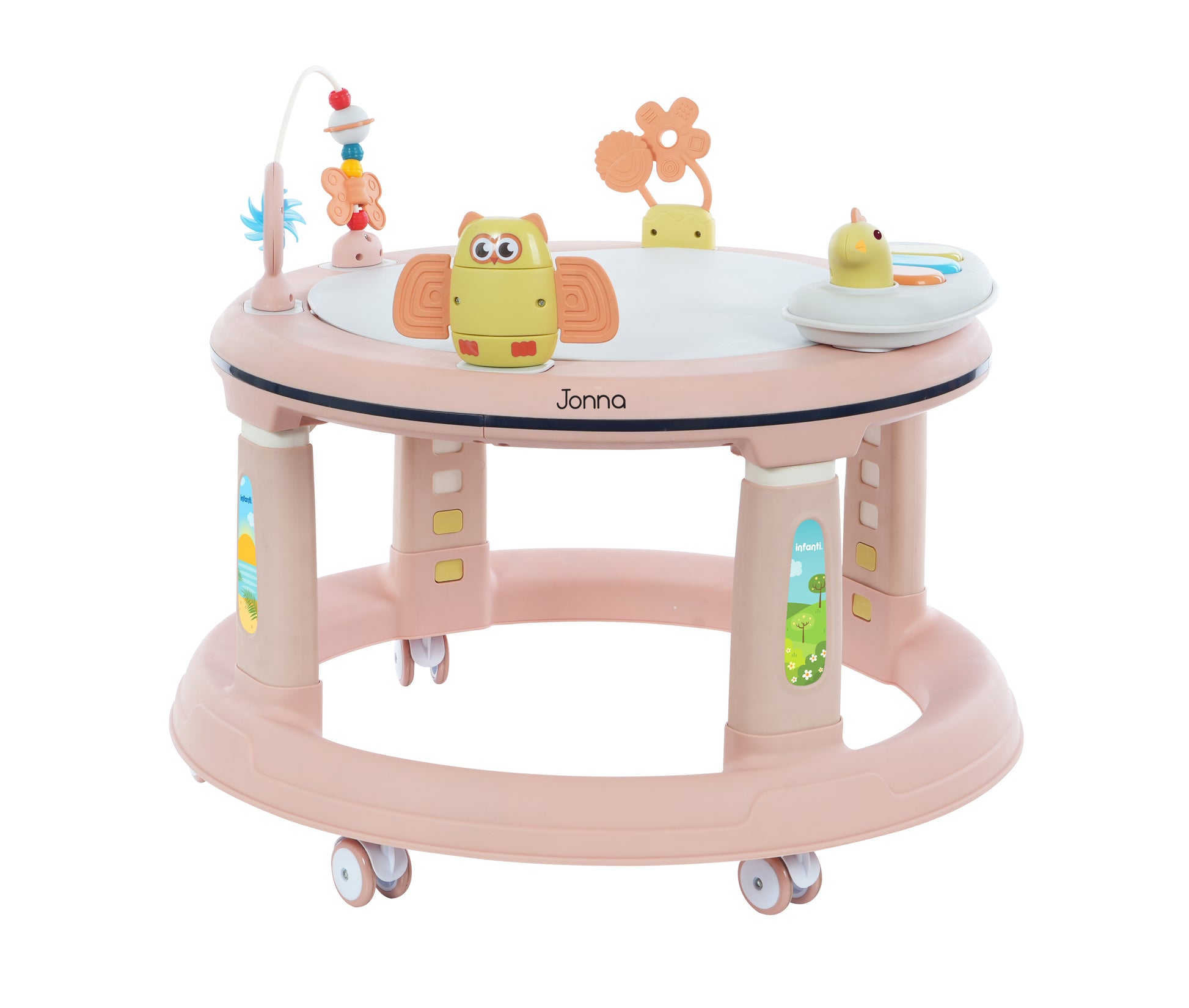 Acompaña el crecimiento de tu bebé con seguridad, comodidad y diversión con la andadera Jonna 4 en 1. Cuenta con un asiento giratorio de 360°, altura ajustable y juguetes con sonido que harán de sus primeros pasos una experiencia inolvidable. Además, se transforma fácilmente en un centro de entretenimiento, mesita interactiva y mesita.