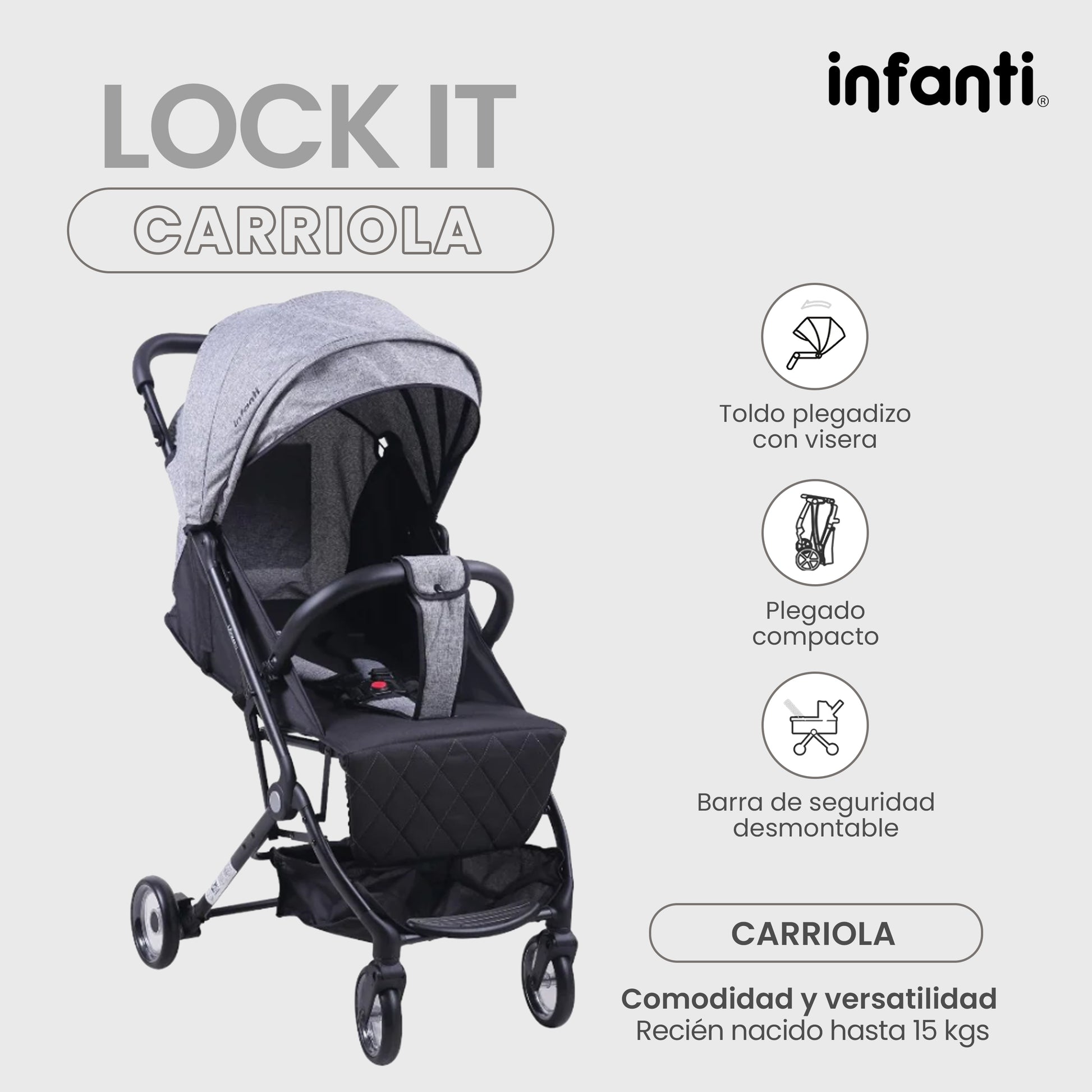 La Carriola Tipo Maleta con Barra de Seguridad es la opción ideal para los padres que buscan una solución práctica y portátil para los paseos diarios y los viajes con su bebé, combinando ligereza, comodidad y seguridad en un diseño compacto y moderno.