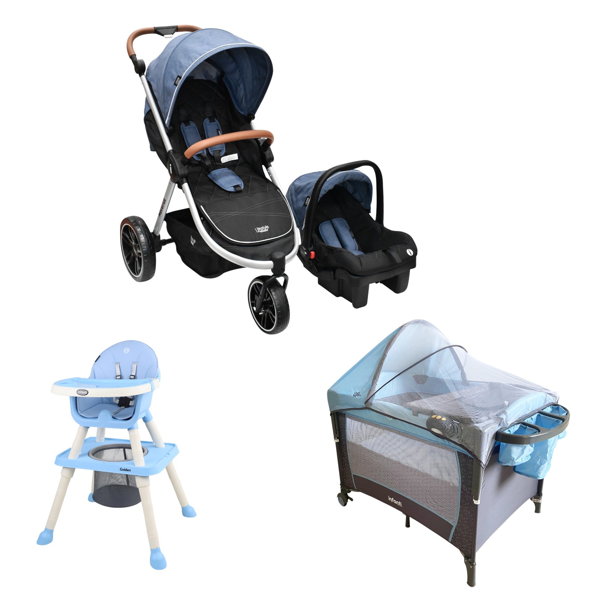 Prepárate para una crianza activa y versátil con este increíble paquete de Infanti. La carriola Maverick TS, con su diseño deportivo de 3 ruedas y amortiguadores, te ofrece una conducción suave en cualquier terreno e incluye un práctico portabebé que también funciona como autoasiento. Para un descanso seguro y mágico, la cuna-colecho Ariel se adapta a tu cama y cuenta con una tela que brilla en la oscuridad, además de ofrecer doble nivel y un cambiador desmontable. Y a medida que tu bebé crece, la silla 6 en 1 Golden se transforma desde una silla alta para las primeras comidas hasta un escritorio para sus primeras tareas, acompañándolo en cada etapa de su desarrollo.
