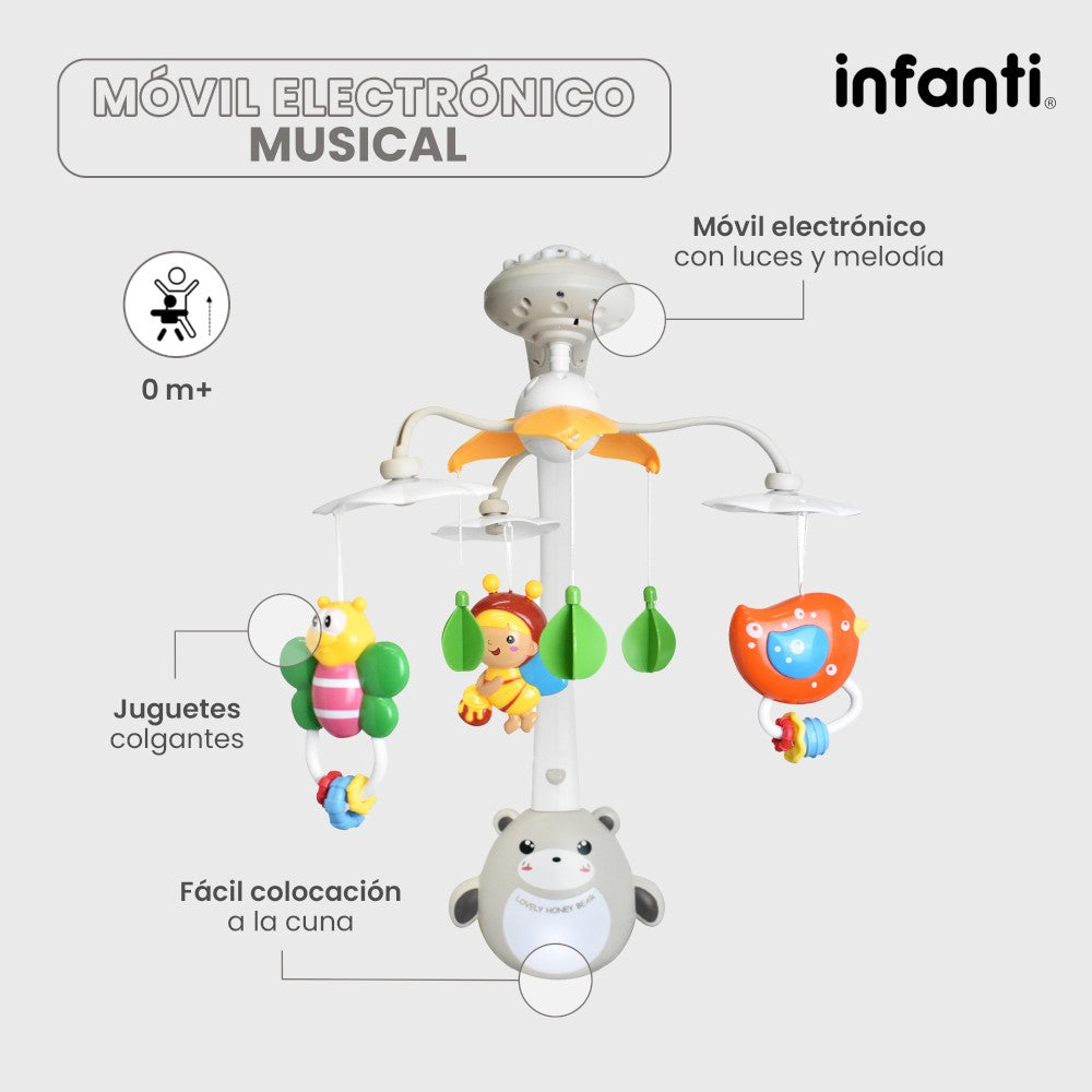 Descubre el móvil electrónico musical de Infanti, el complemento perfecto para el espacio de descanso de tu bebé. Se ajusta con facilidad a la cuna y ofrece melodías suaves diseñadas para calmar y relajar a tu pequeño. Cuenta con juguetes colgantes desmontables que pueden ser usados de forma independiente para entretenimiento adicional. Además, con su ajuste de volumen, suaves luces y un práctico control remoto, puedes personalizar la experiencia para garantizar dulces sueños a tu bebé en todo momento.