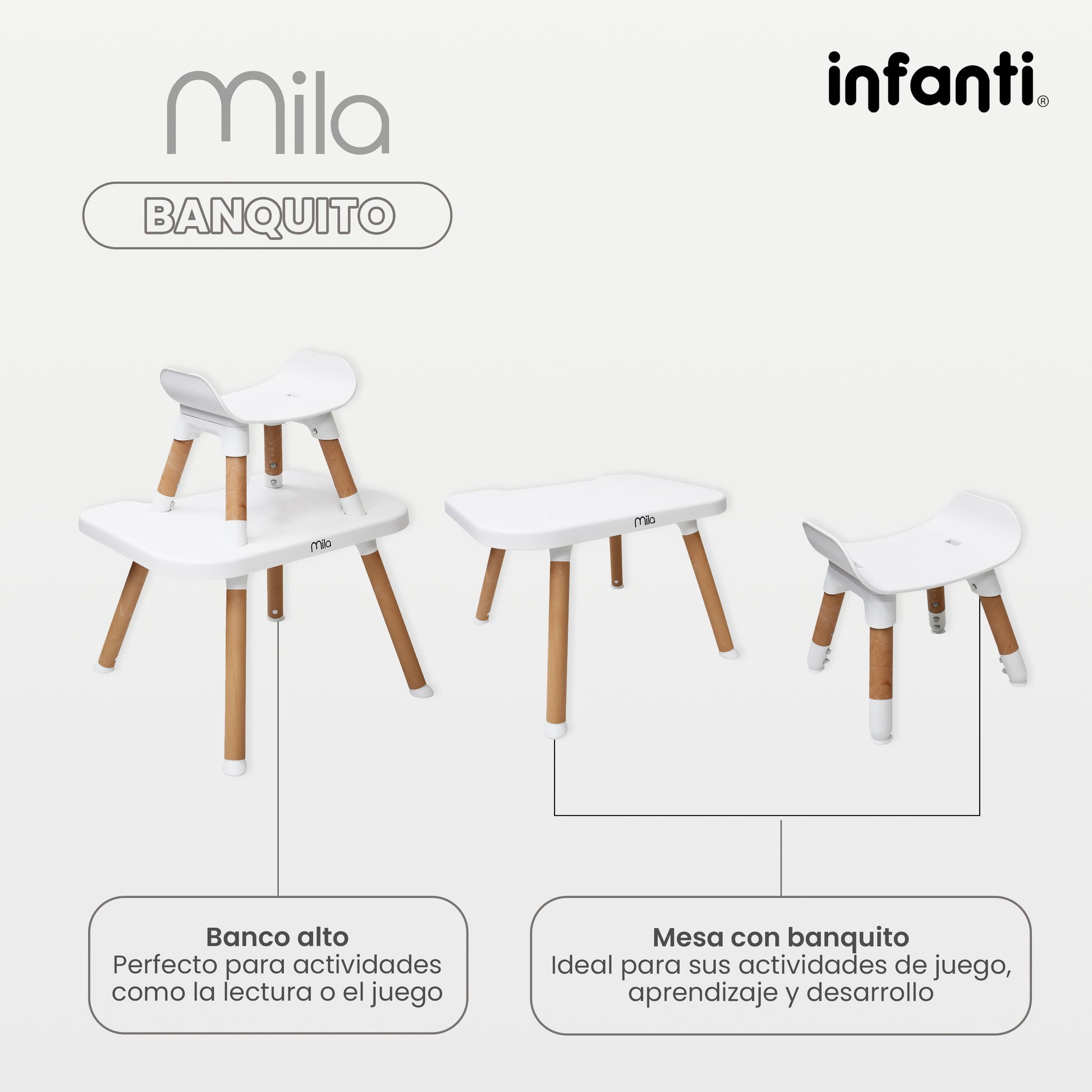 3.-Banco alto: En su función de banco alto, Mila ofrece un asiento más elevado que es perfecto para actividades como la lectura o el juego. Además, es fácil de ajustar de acuerdo con las necesidades del niño.